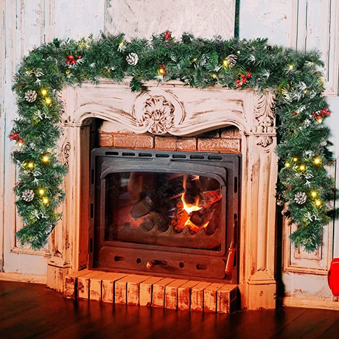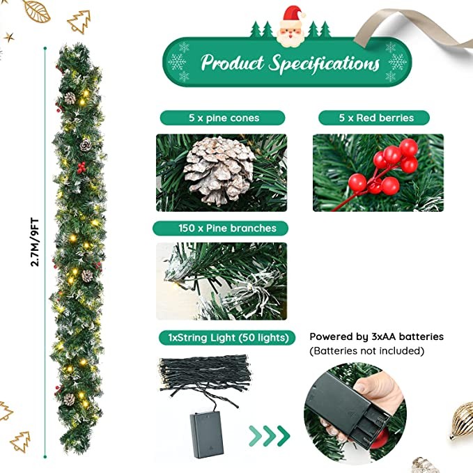 2.7M Christmas Garland With Lights 9FT Artificial Wreath Garland Green Artificial Xmas Garlands with Pine Cones Red Berries Outdoor Decorations Prelit Garland For Fireplace Stairs