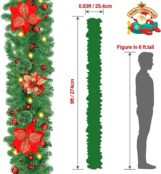 SHAVINGFUN Christmas garland,christmas garland with lights,2.7M/ 9FT Christmas Garland Decorations Illuminated with LED Lights,for Stairs Fireplaces Christmas Festive Wreath Xmas Decor